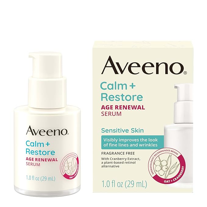 Aveeno Calm + Restore Age Renewal Face Serum is a fragrance-free, anti-aging treatment that’s specifically formulated for sensitive skin. It’s packed with nourishing oat and cranberry extract, which are known for their soothing properties. The formula also includes niacinamide—Vitamin B3—known for its brightening and skin-repairing qualities, as well as cranberry extract, a plant-based alternative to retinol that’s gentle but effective in reducing the appearance of wrinkles and fine lines.
