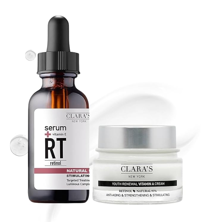 Introducing Clara’s New York Stimulating Pure Retinol Serum for Face and Youth Renewal Vitamin A Cream. This set comes with a 1 fl oz Retinol Serum and a 50 ml Vitamin A Cream, formulated to enhance skin texture, hydration, and overall appearance. Both products are lightweight, non-greasy, and made to fit seamlessly into your evening routine.