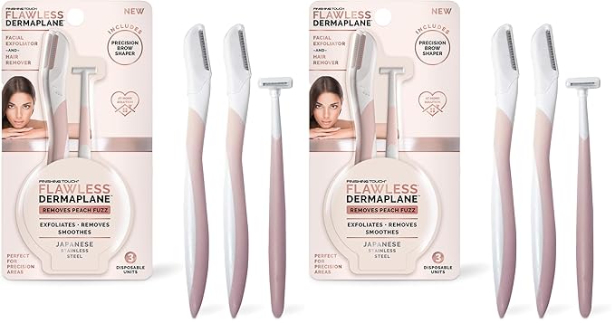 The Finishing Touch Flawless DermaPlane Travel Pack includes two dermaplane facial exfoliators and one mini hair remover, all in a convenient travel-sized pack. These tools are designed to exfoliate your skin, remove peach fuzz, and even shape your eyebrows with precision. The packaging is compact, making it easy to carry on trips or store in your handbag—definitely a great option for anyone who loves having beauty tools handy at all times.