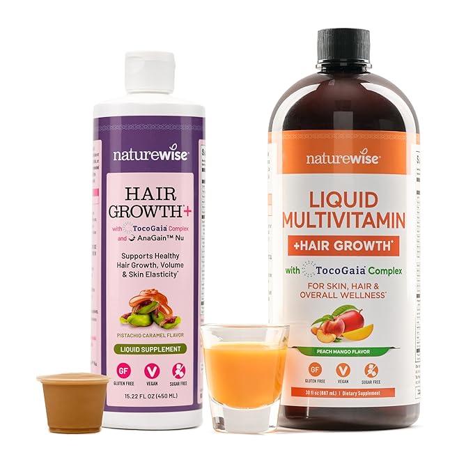 Now, let’s dive into what the NatureWise Grow Back Bundle is all about. This bundle includes two products—Hair Growth Plus and Liquid Multivitamin + Hair Growth—that claim to help improve hair shedding and promote new hair growth. The key ingredients here are AnaGain Nu, an organic pea extract that’s clinically proven to reduce hair shedding in as little as a month, and TocoGaia, a natural full-spectrum vitamin E derived from palm fruit, which supports hair density and overall hair health.