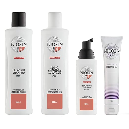 Nioxin System Kit 4 is specifically designed for those with damaged, thin, or chemically treated hair. The kit includes a shampoo, conditioner, and a deep protective density mask, aimed at improving hair thickness and reducing breakage. It promises to cleanse the scalp, strengthen hair from the roots, and prevent further damage, while helping to restore vitality to over-processed locks.