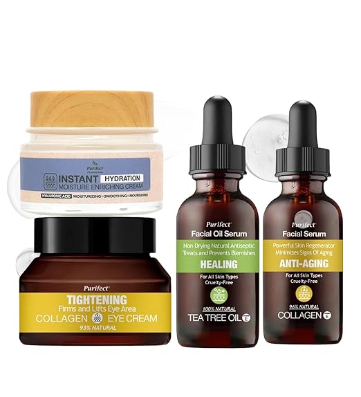 First up, this bundle includes four core items: a Tea Tree Oil Facial Serum, a Collagen Facial Serum, a Hydrating Hyaluronic Acid Cream, and a Collagen Eye Cream. These products are all formulated to provide targeted care for your skin, and what sets this set apart is its inclusion of some powerhouse ingredients like Tea Tree Oil, Vitamin E, and Hyaluronic Acid—ingredients that we know work wonders for hydration, soothing inflammation, and promoting a more youthful complexion.